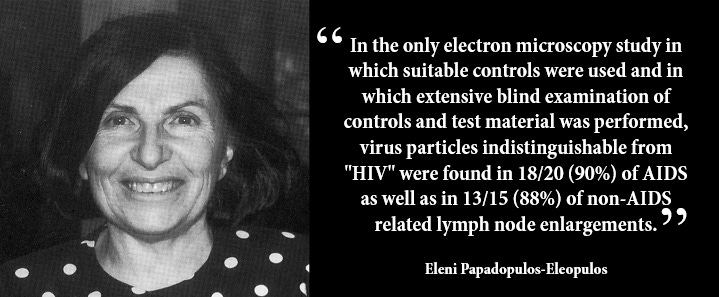 “In the only EM study, either in vivo or in vitro, in which suitable controls were used and in which extensive blind examination of controls and test material was performed, virus particles indistinguishable from HIV were found in a variety of non-HIV associated reactive lymphadenopathies leading the authors to conclude: “The presence of such particles do not, by themselves indicate infection with HIV.”