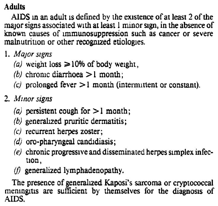 In 1986, for instance, the World Health Organization introduced a diagnostic criterion for developing countries that classified anyone with a handful of common, non-specific symptoms—such as weight loss and diarrhea—as an AIDS patient.